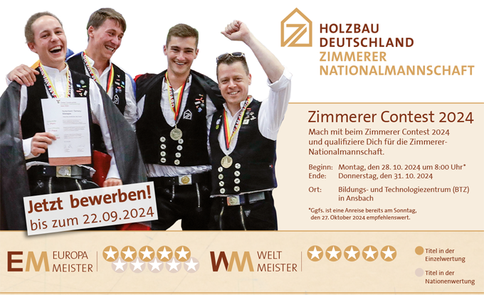 Der Zimmerer Contest ist der erste Schritt auf dem Weg zum Titel. Wer Weltmeister werden will, ist dort genau richtig. Denn beim Zimmerer Contest wird jedes Jahr aufs Neue entschieden, wer Ende des Jahres in das neue Team der Zimmerer-Nationalmannschaft aufgenommen wird. 2024 findet er von Montag, 28. bis Donnerstag, 31. Oktober im Bildungs- und Technologiezentrum (BTZ) Ansbach statt.